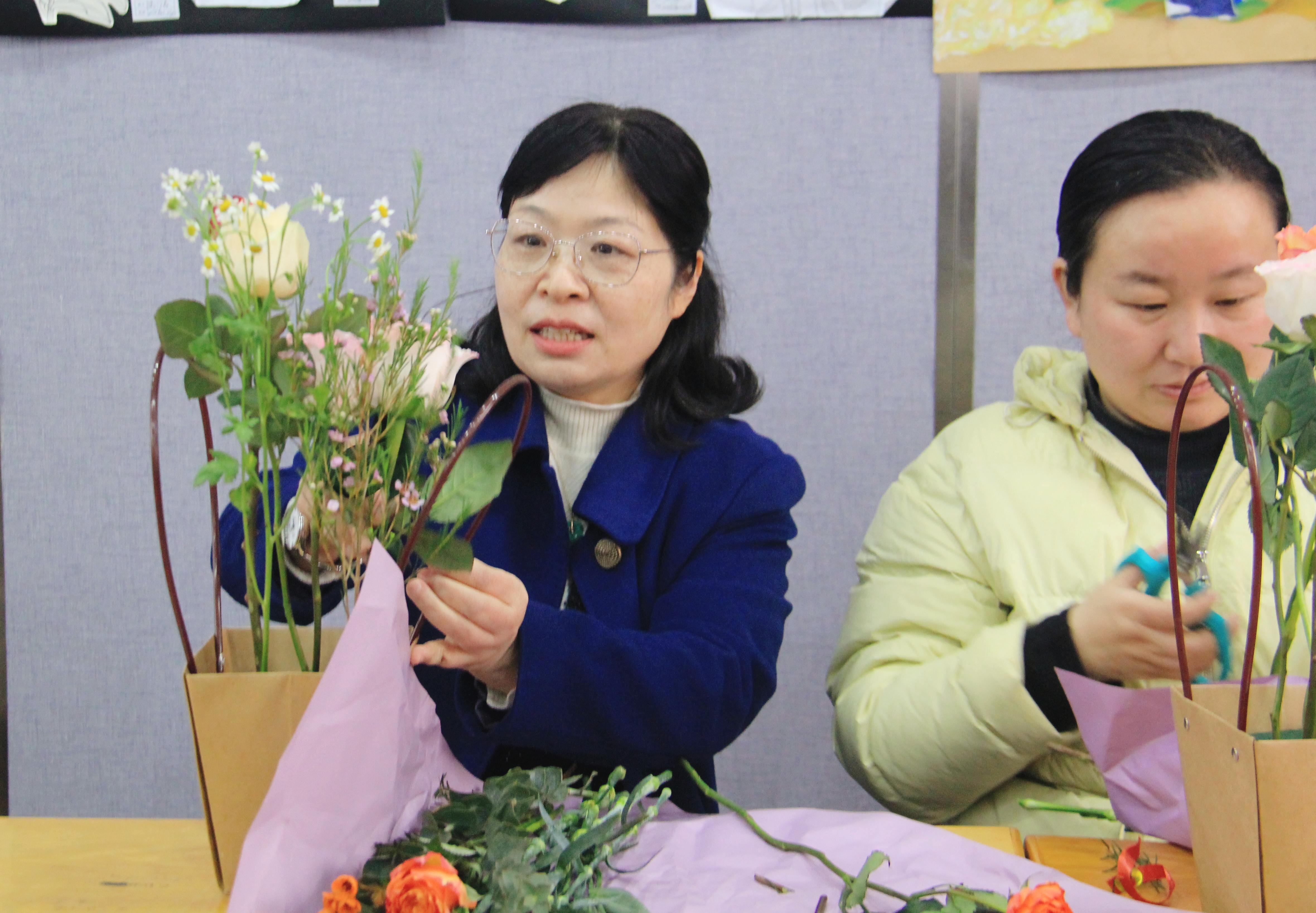 在轻柔的音乐中,张琪佳老师从花卉品种、色彩搭配、插花技巧等方面进行讲解示范。女教师们跃跃欲试,精心修剪枝叶、构思造型,将玫瑰、康乃馨、向日葵等鲜花错落有致地组合成独具匠心的花篮。活动现场花香四溢,欢声笑语不断,大家互相交流创作灵感,用巧手诠释对生活的热爱。