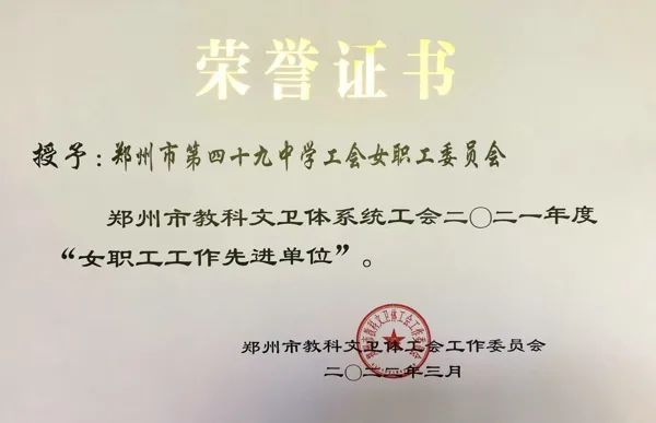 【工会】喜讯!郑州49中荣获“郑州市教科文卫体系统工会女职工工作先进单位”称号
