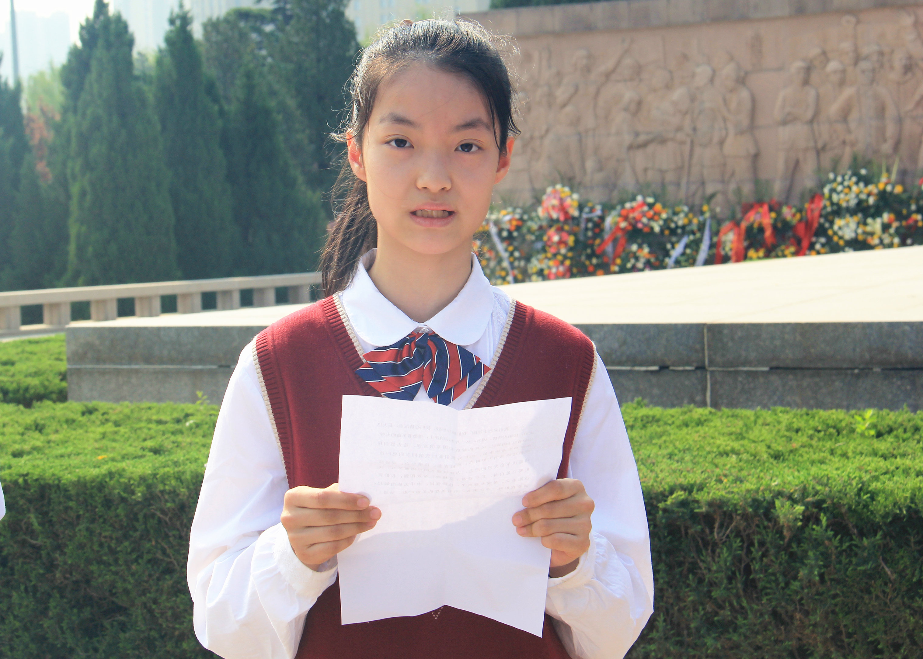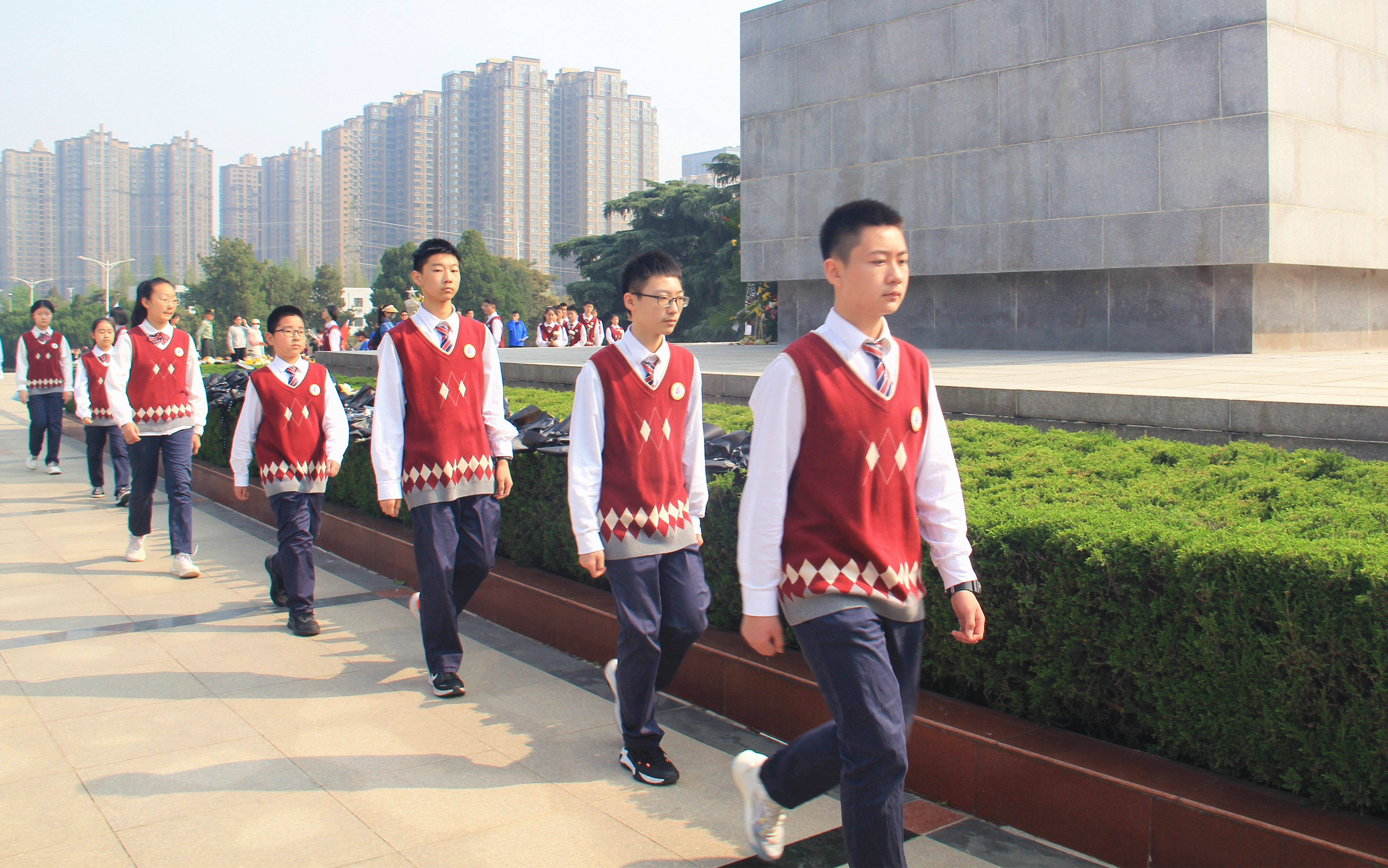 郑州49中师生代表整齐列队,缓步走向烈士纪念碑。