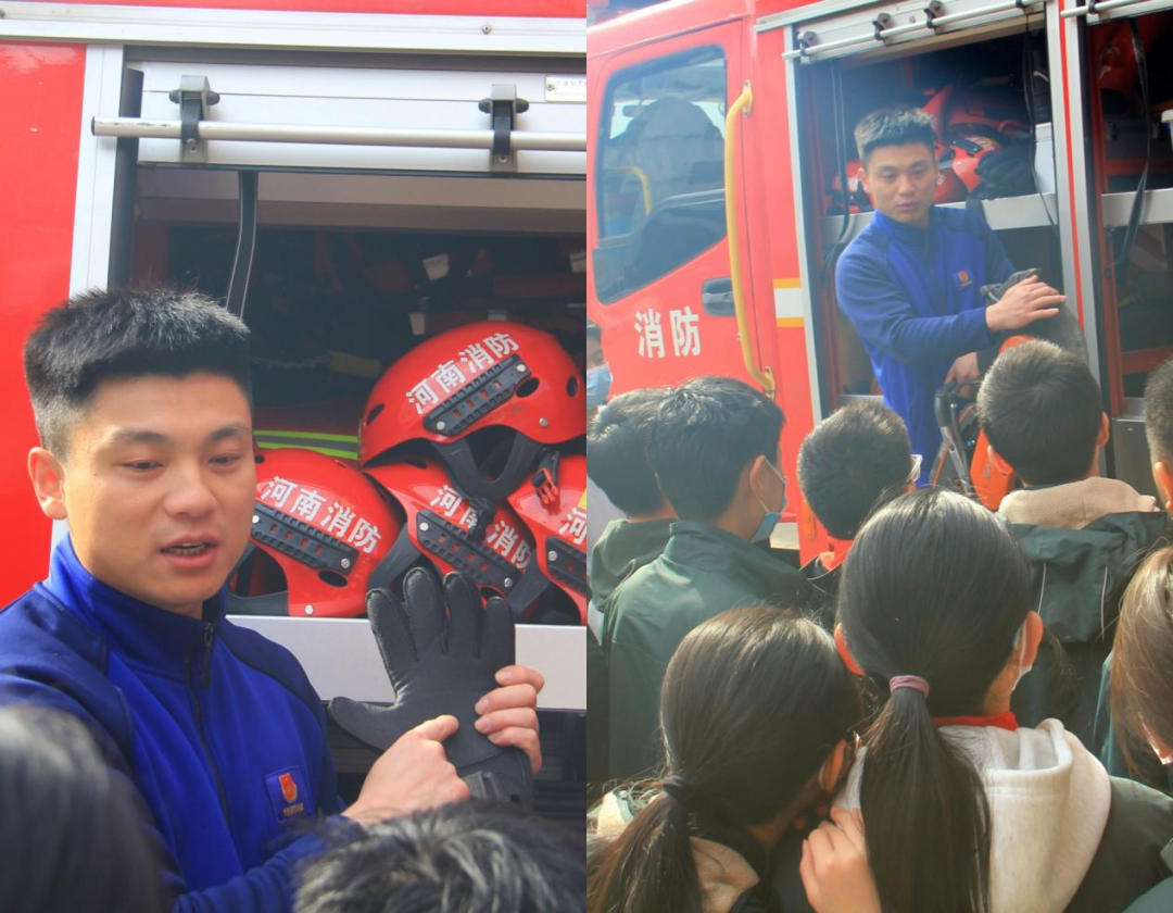 同学们怀揣着好奇与期待有序进入消防站。南阳路消防站申队长为学生们讲解了消防安全知识,带领同学们参观了消防车辆和各类消防装备,并针对不同设备的功能进行了现场演示。通过体验操作,学生们对消防安全有了更深层次的了解。面对平日里难得一见的专业设备,同学们充满好奇,纷纷举手提问,申队长耐心细致地进行讲解,申队长通过实物展示和动作示范耐心解答,让抽象的消防知识变得生动直观。