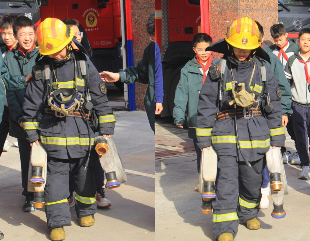 在实践体验环节,同学们穿上了消防服,亲身体验了一把当消防员的感觉。尽管装备限制了行动灵活性,但亲身体验让大家真切感受到消防员工作的艰辛。当申队长告诉同学们这套消防服他们在出任务时需要13秒的时间穿好时,同学们既惊讶又佩服。