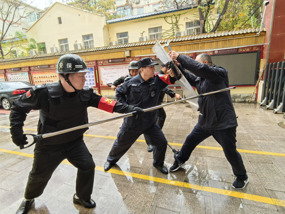 据悉,七初东校区高度重视,精心组织,成立了由分管安全副校长为组长的演练领导小组,全面统筹并细致规划活动的每一个环节。接着,保安公司队长首先详细讲解了警棍盾牌、钢叉等防暴器材的正确使用方法,并深入传授了反冲撞、防砍杀及对抗演练等反恐实战技能,还现场示范了在突发情况下的应急处置流程,包括如何迅速制服“歹徒”、如何有效防止“歹徒”进入人口密集区域等战术技巧,有利于提升校园安保人员的应急响应与处置能力。