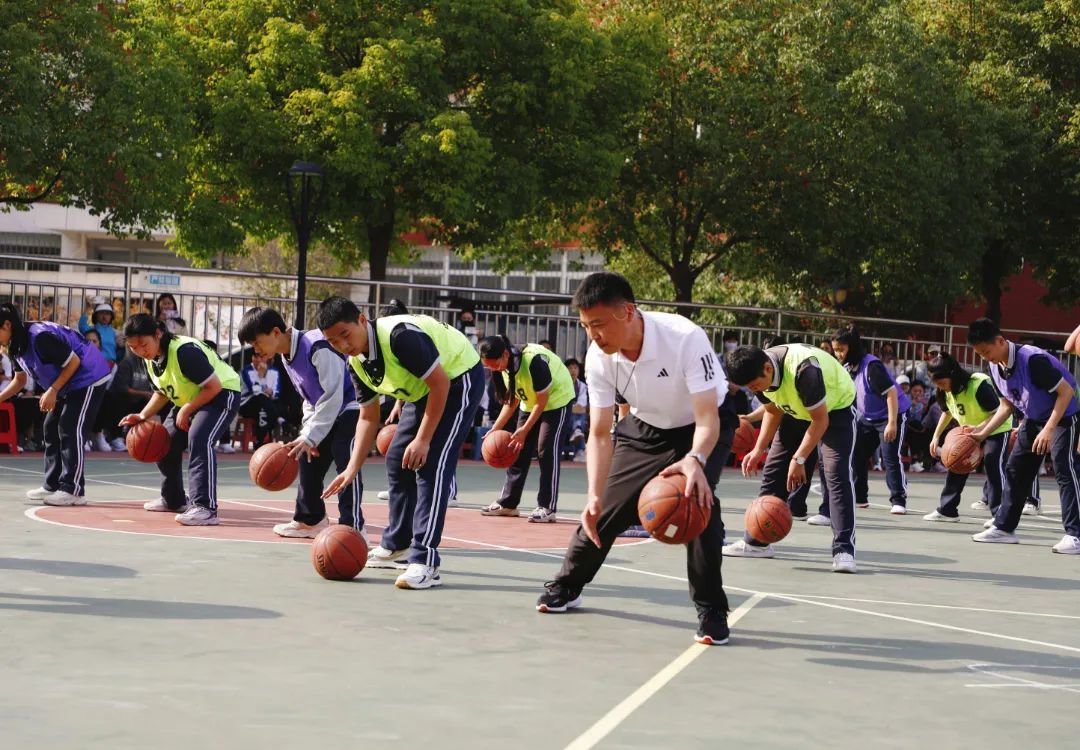 课堂中,徐光辉老师以学生练习学习的视角进行设计,全程以变向换手运球技术为核心进行不同层次和方式的学习设计。在开始部分,围绕变向换手运球的技术特点,设计热身和游戏,让学生活动中熟悉球性,发现问题,激发学习兴趣。