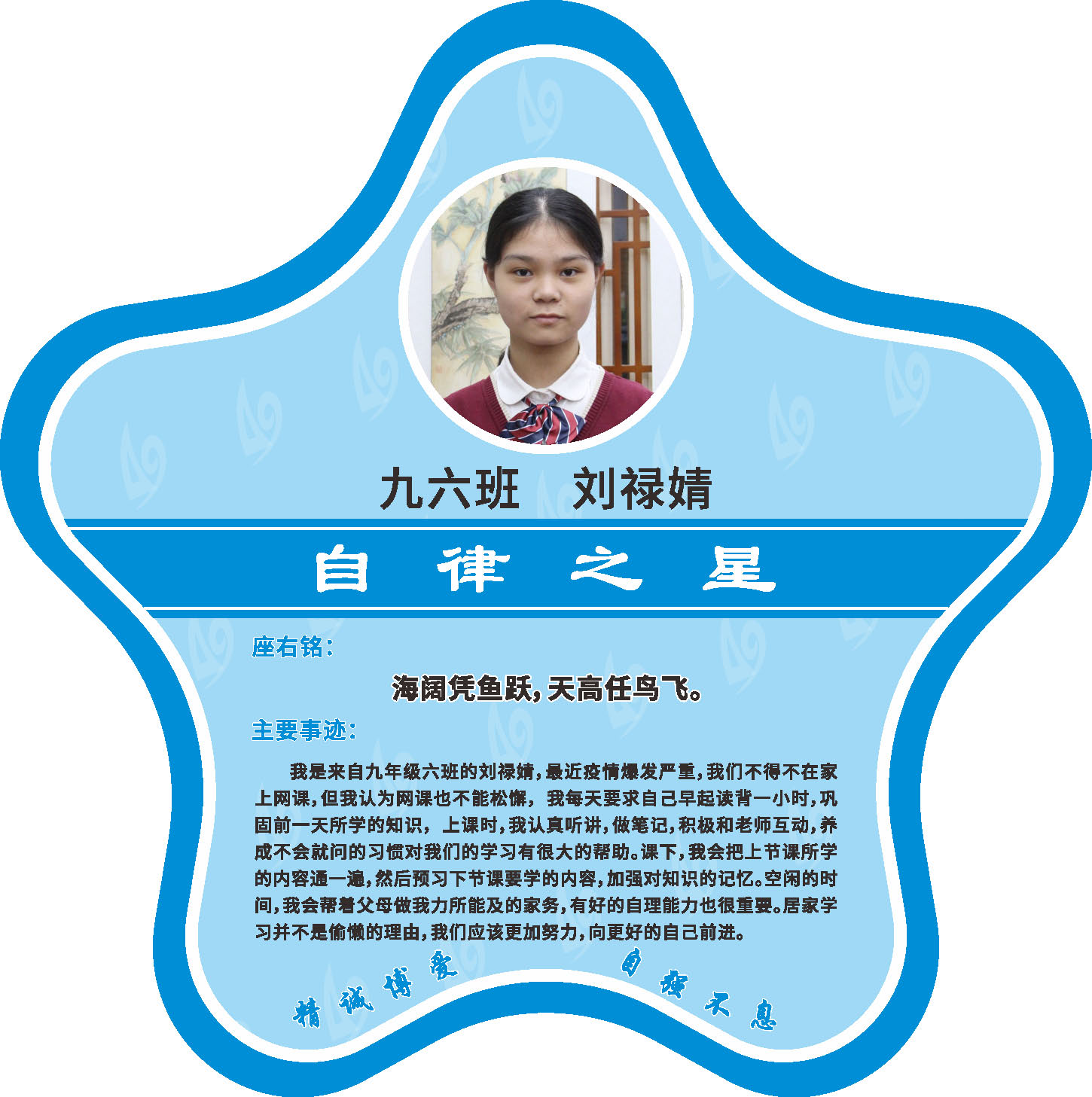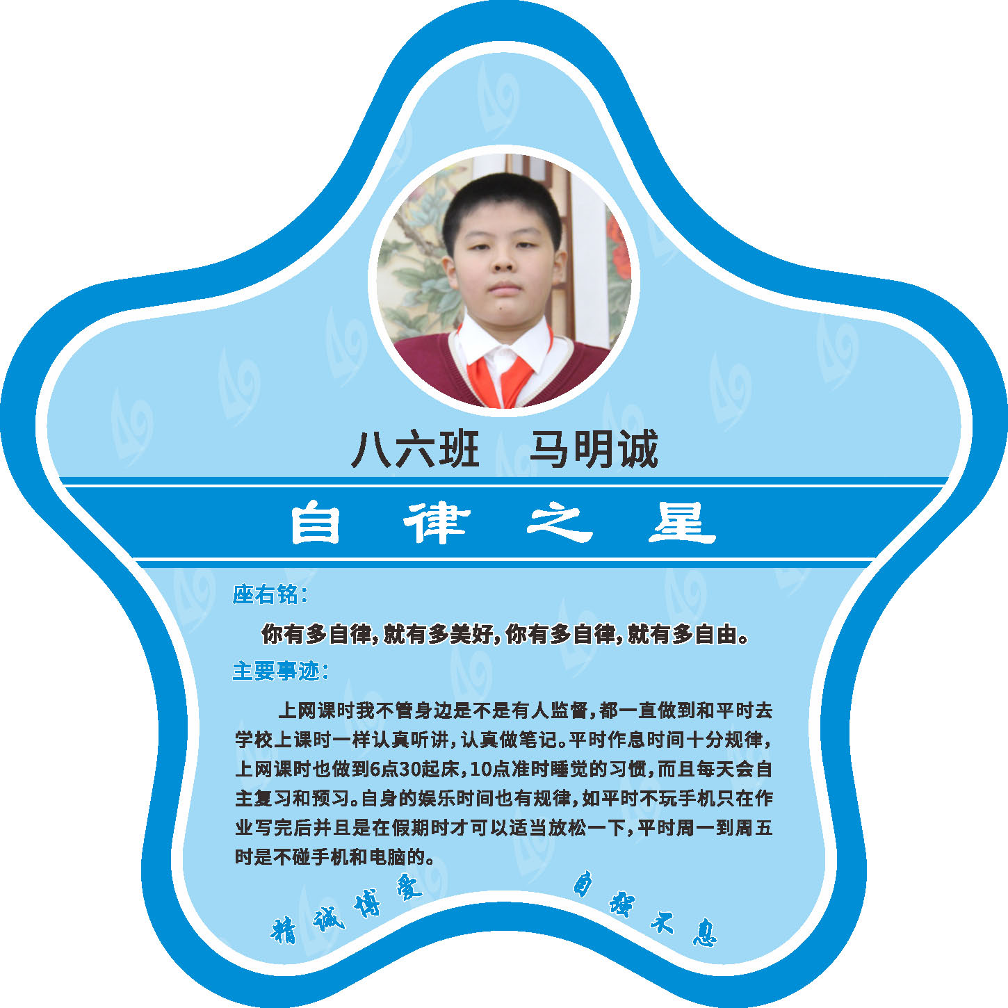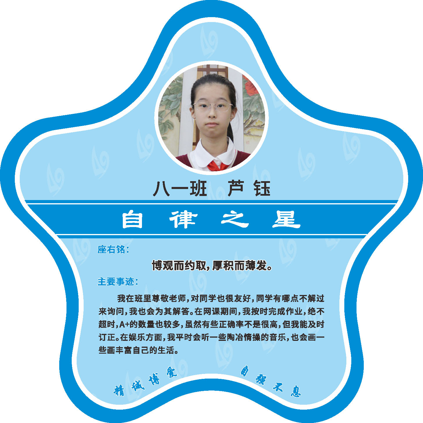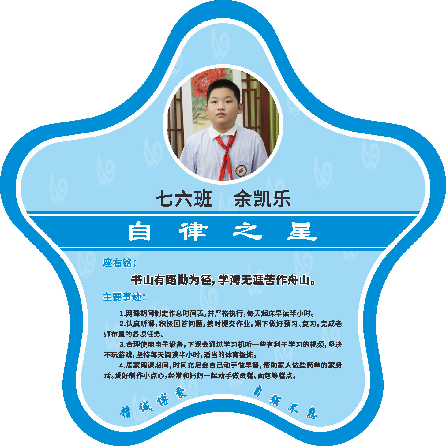 有明确的居家学习生活计划,并严格执行。认真有效的预习、 听课、复习,按时完成各项作业,合理使用电子设备,每天坚持阅读和体育锻炼。生活积极乐观,承担力所能及的家务,有自己的一项兴趣爱好,并为之付出努力。现经个人申报,班级推荐,学校审核,评选出2022年10月《自律之星》。