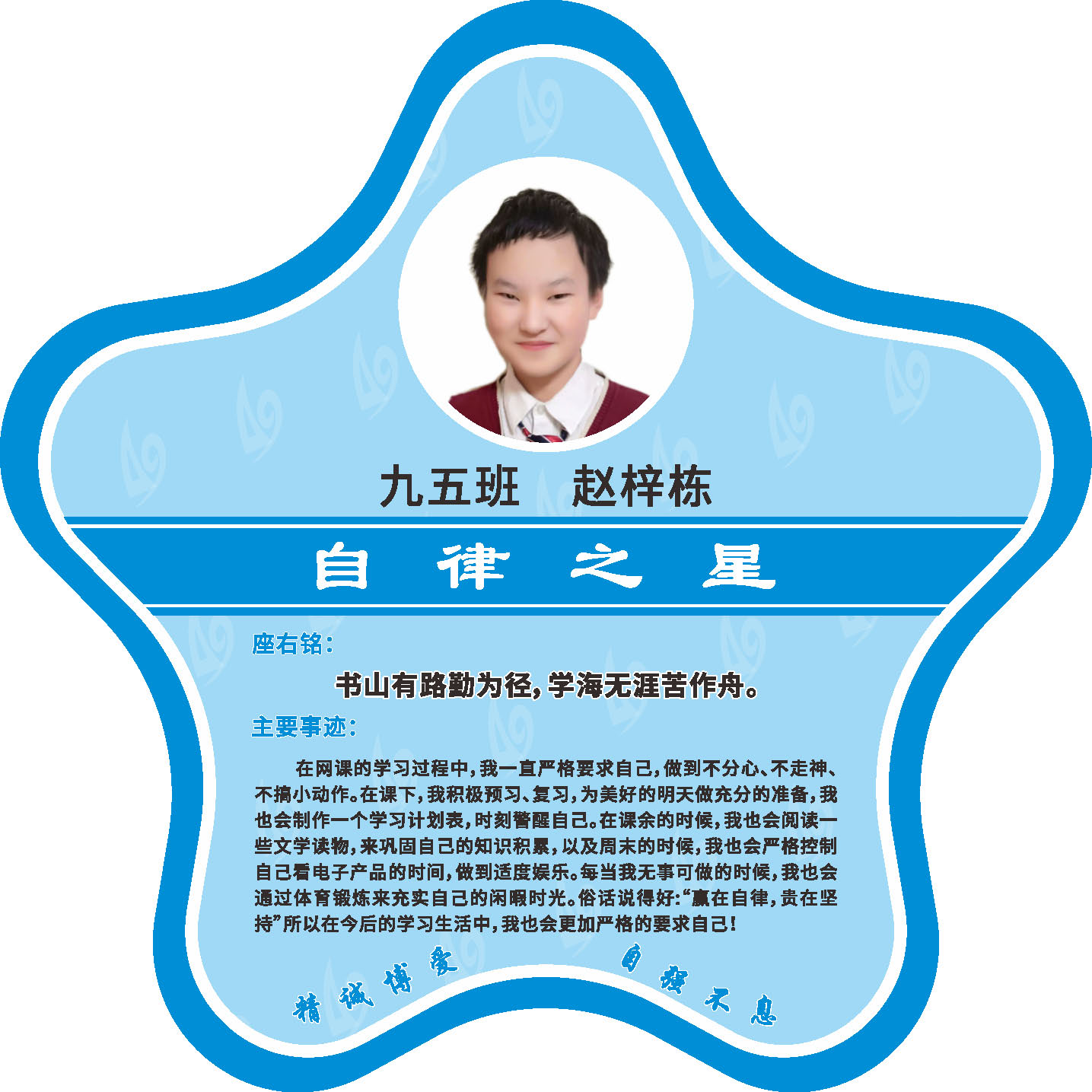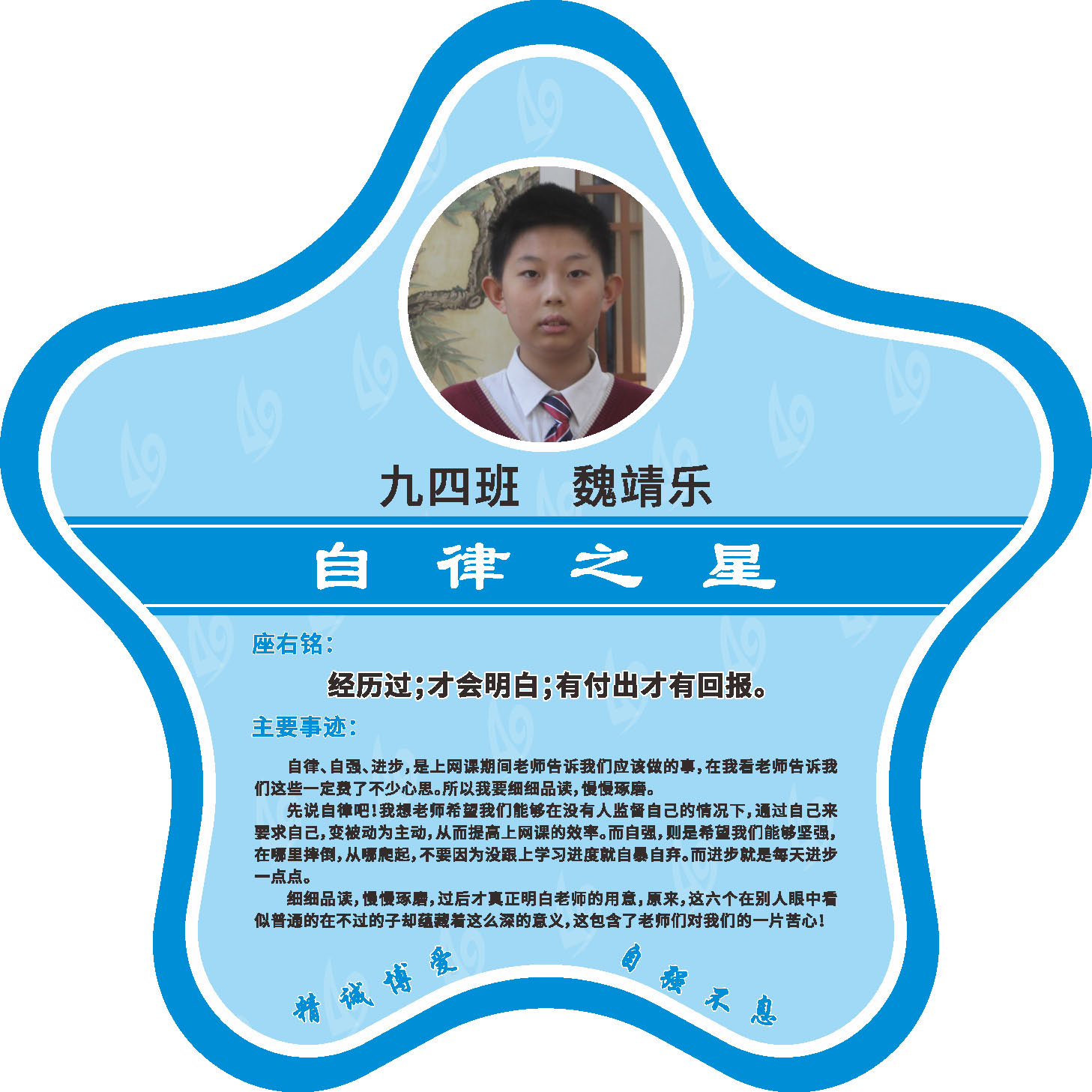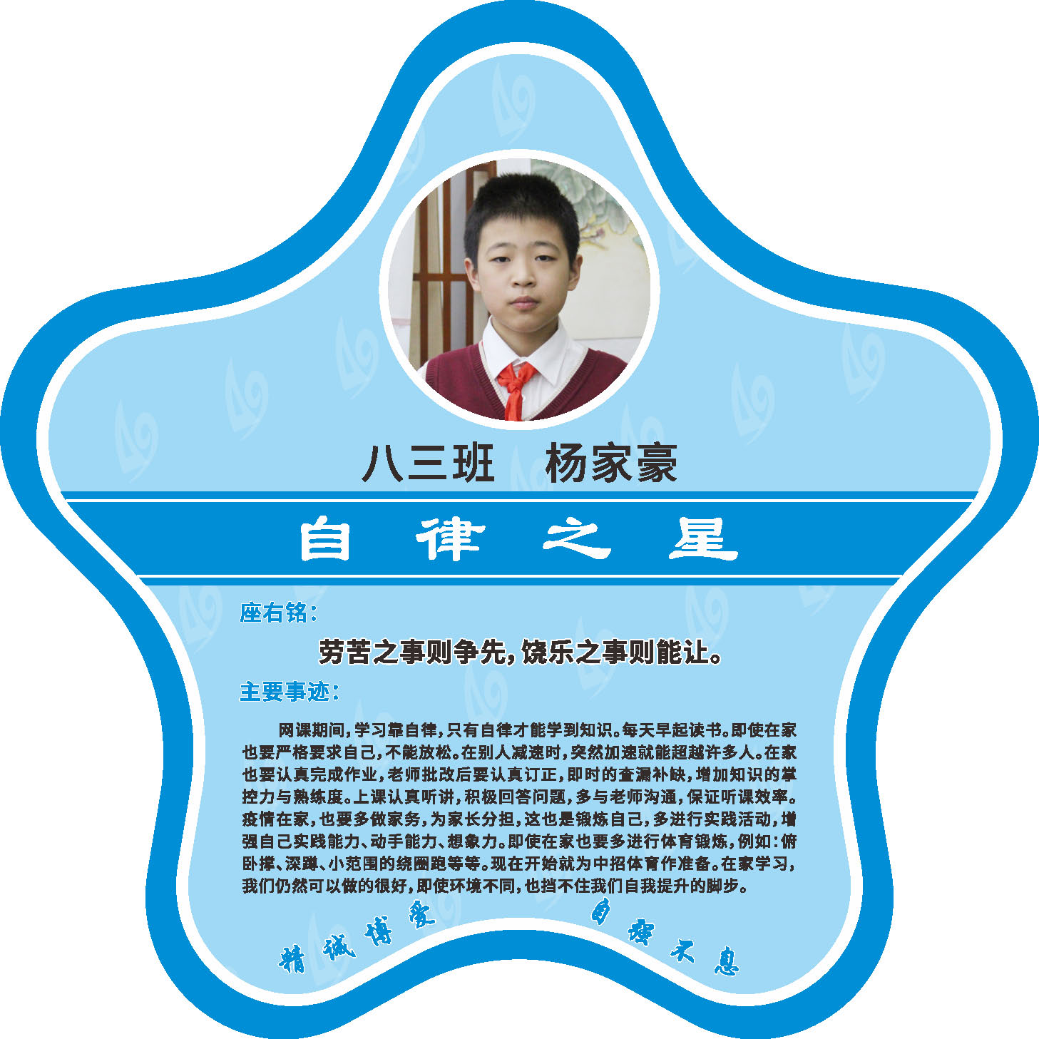 有明确的居家学习生活计划,并严格执行。认真有效的预习、 听课、复习,按时完成各项作业,合理使用电子设备,每天坚持阅读和体育锻炼。生活积极乐观,承担力所能及的家务,有自己的一项兴趣爱好,并为之付出努力。现经个人申报,班级推荐,学校审核,评选出2022年10月《自律之星》。