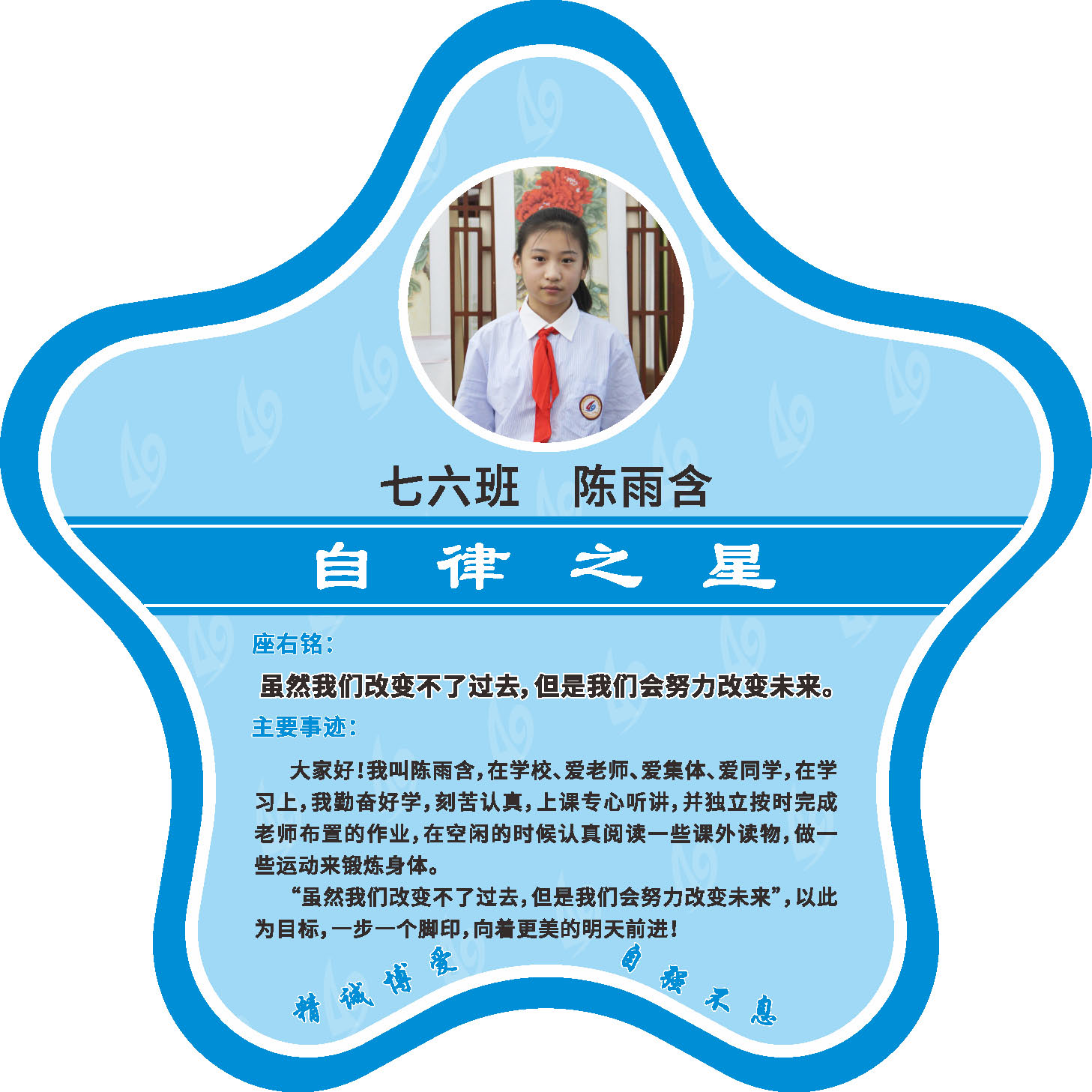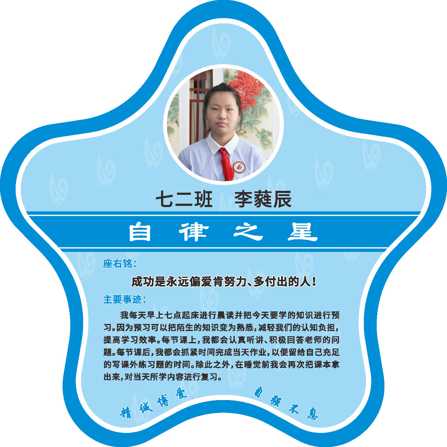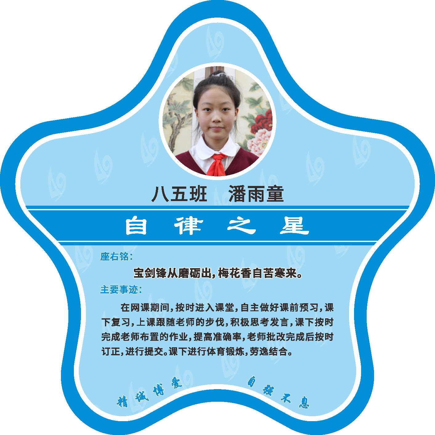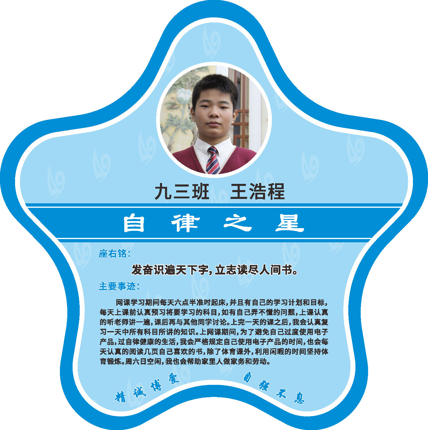 有明确的居家学习生活计划,并严格执行。认真有效的预习、 听课、复习,按时完成各项作业,合理使用电子设备,每天坚持阅读和体育锻炼。生活积极乐观,承担力所能及的家务,有自己的一项兴趣爱好,并为之付出努力。现经个人申报,班级推荐,学校审核,评选出2022年10月《自律之星》。