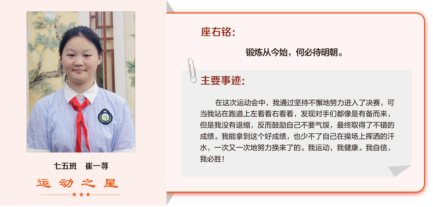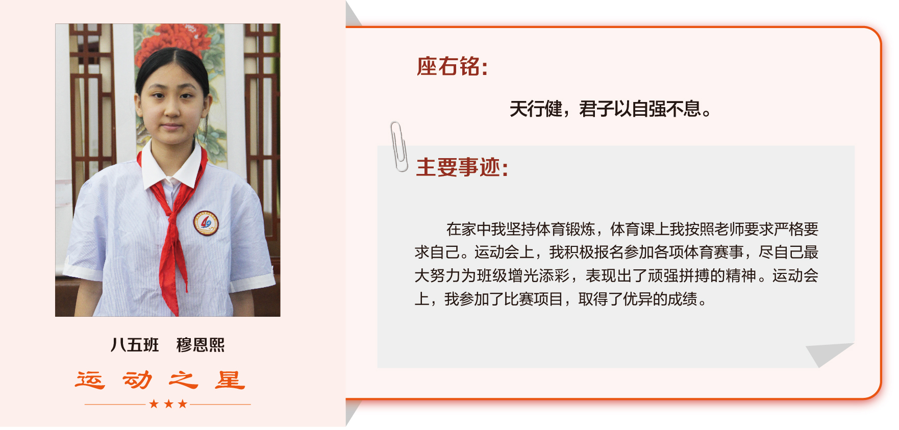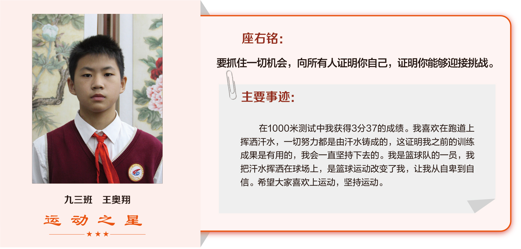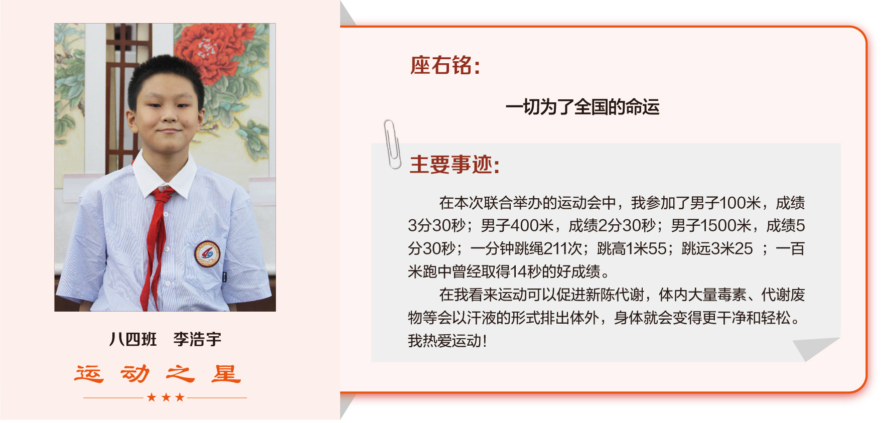 他们在运动会期间为班级争光,奔跑在运动场上,他们认真做眼保健操,大课间整齐跑步,口号响亮,经个人申报,班级推荐,学校审核评选出本期《运动之星》。