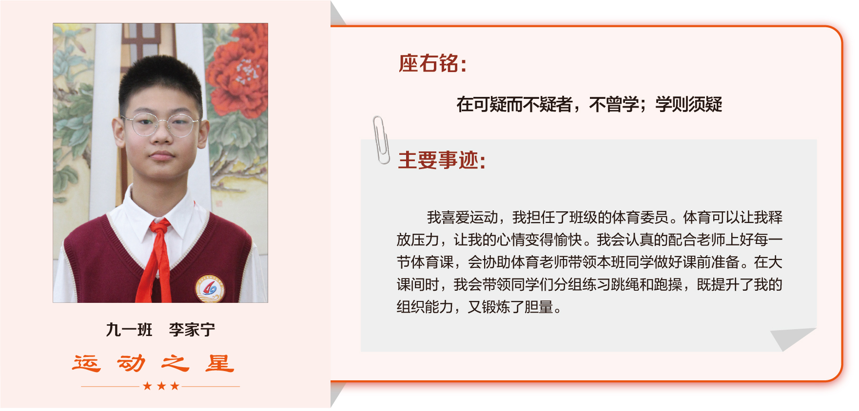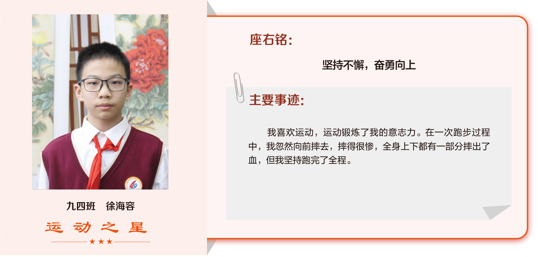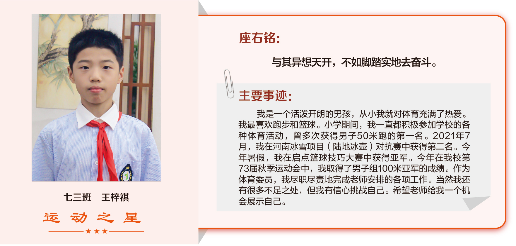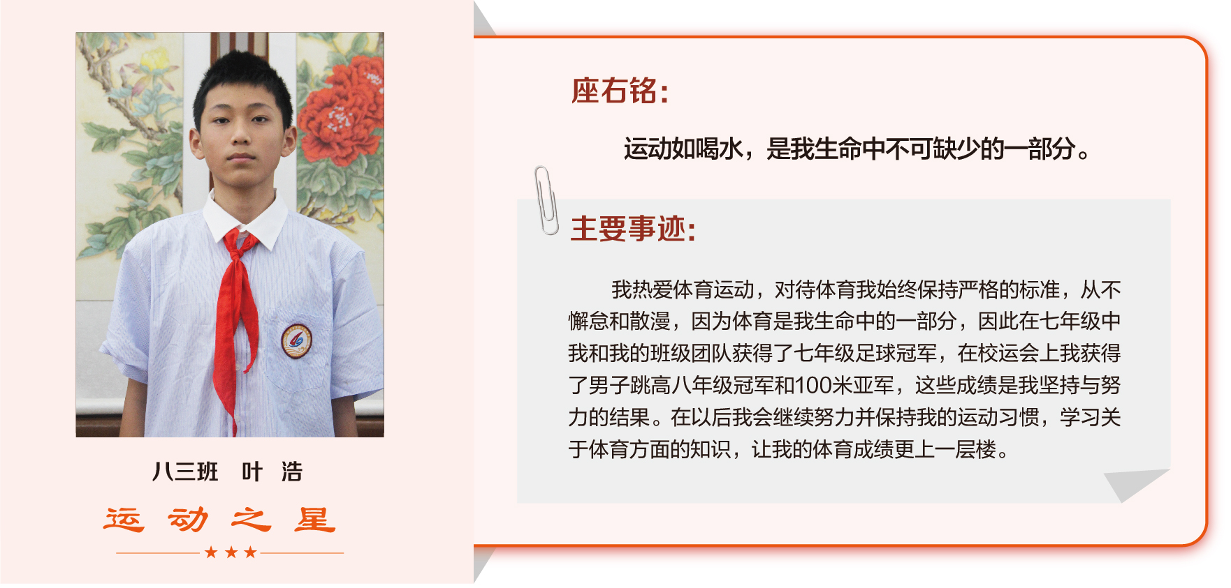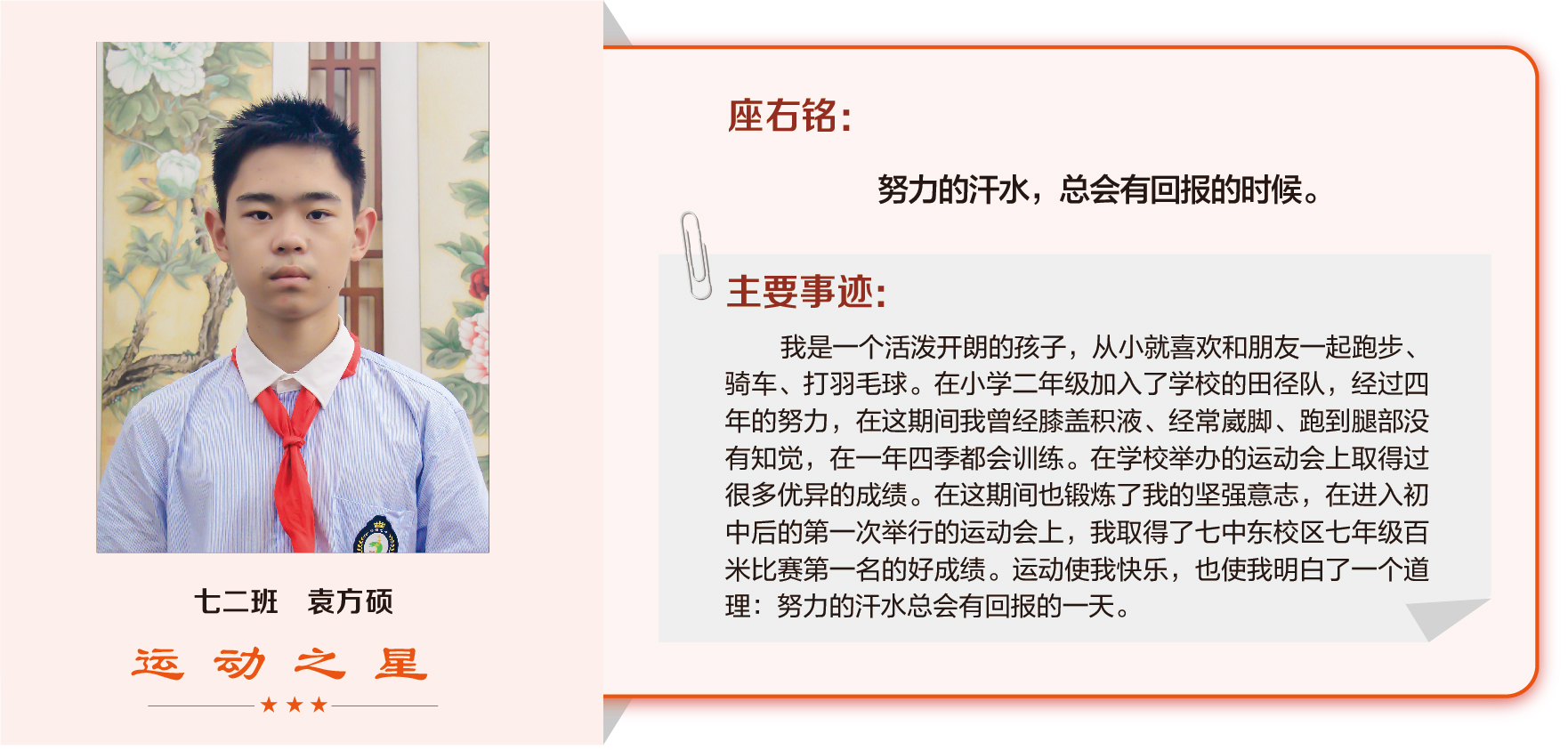 他们在运动会期间为班级争光,奔跑在运动场上,他们认真做眼保健操,大课间整齐跑步,口号响亮,经个人申报,班级推荐,学校审核评选出本期《运动之星》。