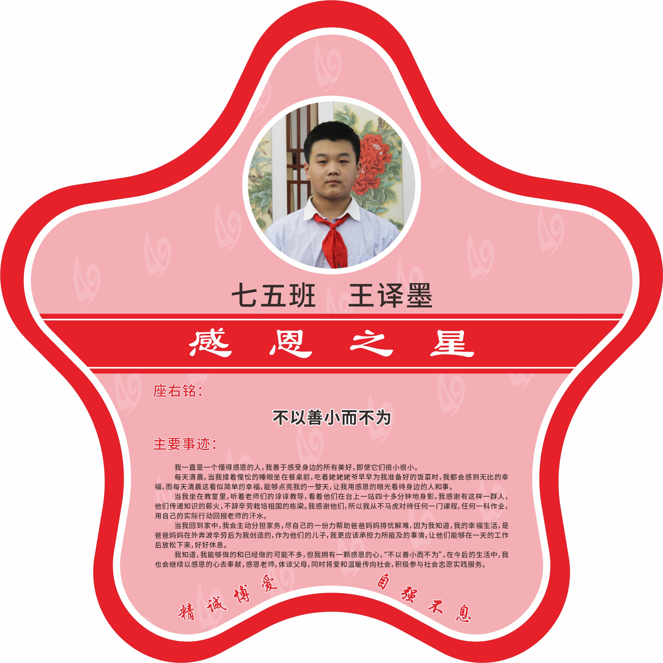 感知身边的幸福与美好,日常生活中理解父母,以实际行动感恩父母,尊重老师,努力学习,感念老师的悉心指导,饮水思源,承担责任,对同伴、对家庭、对社会传递阳光和温暖。现经个人申报,班级推荐,学校审核,评选出2022年11月《感恩之星》。
