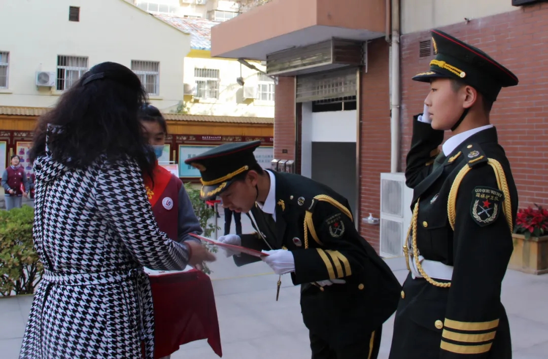 郑州49中副校长宋琪为国旗班成员颁发聘书