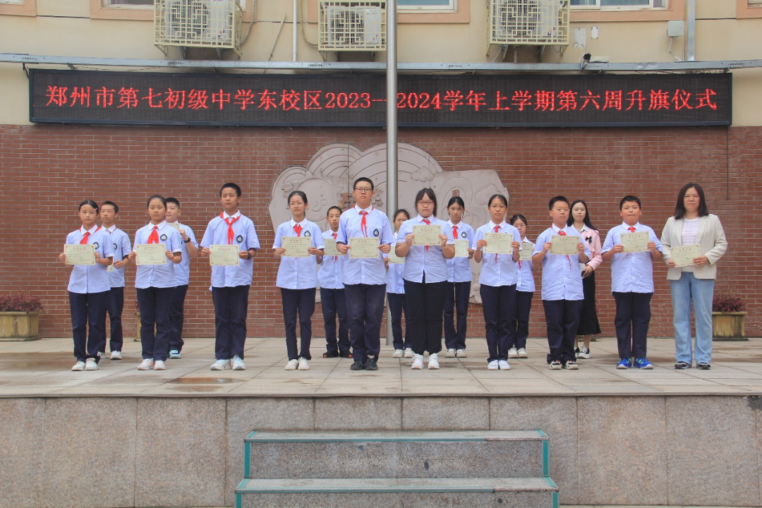 在升旗仪式上为“地球仪手工制作”获奖同学颁奖