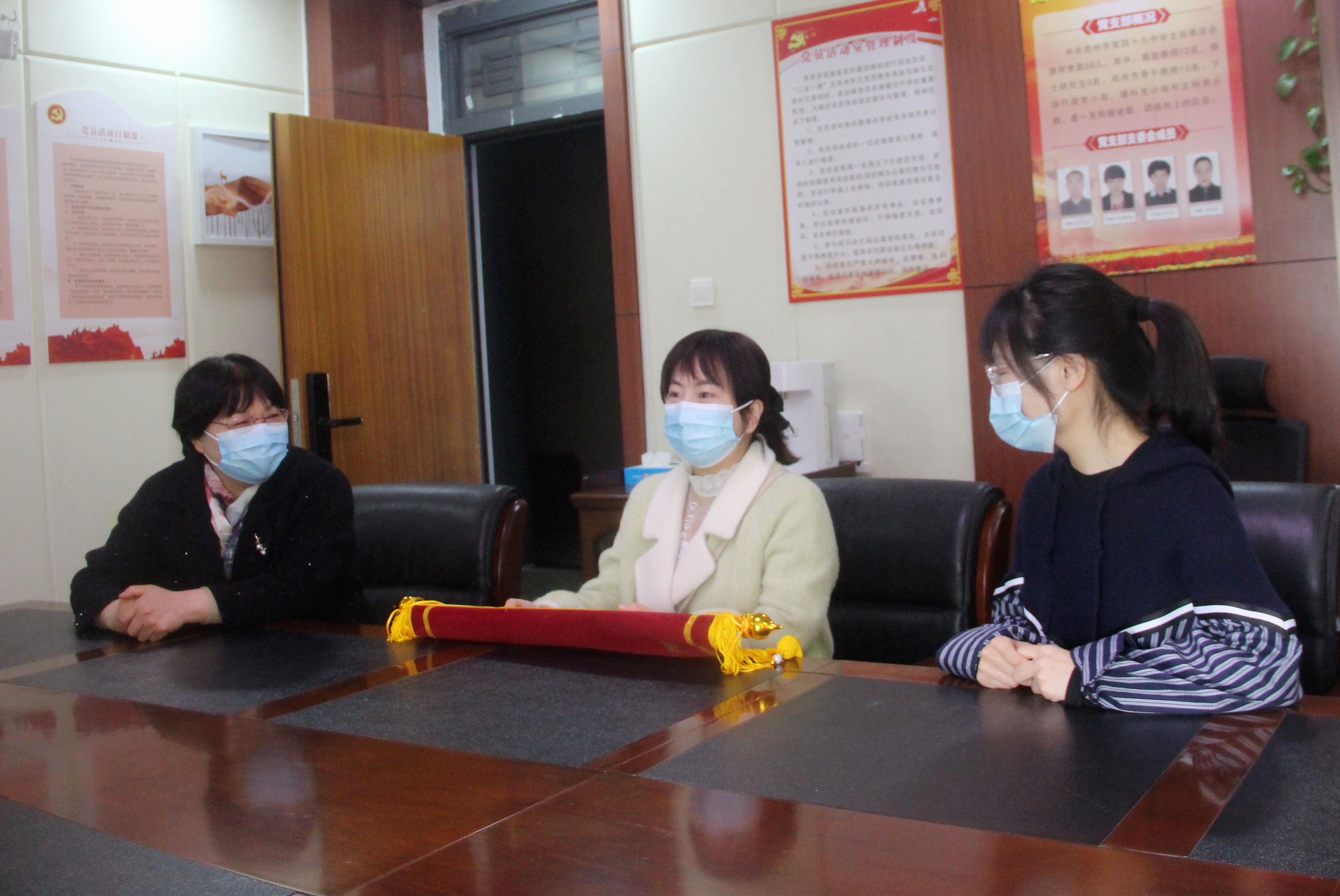 张永红与家长在会议室座谈