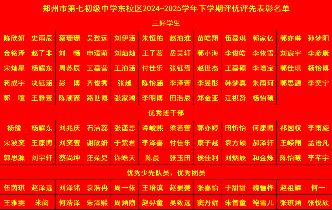 三好学生、优秀班干、优秀少先队员、优秀团员表彰名单