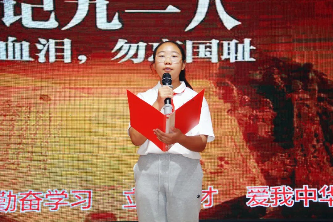 此外,学校还利用校园广播、宣传栏等多种形式,广泛宣传“九一八”事变的历史意义和抗战精神,营造了浓厚的爱国主义教育氛围。七初东校区七年级五班学生董白雪带领全体同学共同宣读《少年中国说》。“少年强则国强,少年独立则国独立;少年自由则国自由;少年进步则国进步……”大家激昂的声音在报告厅久久回荡,每个字都像是充满力量的火种,点燃了同学们心中的爱国热情。