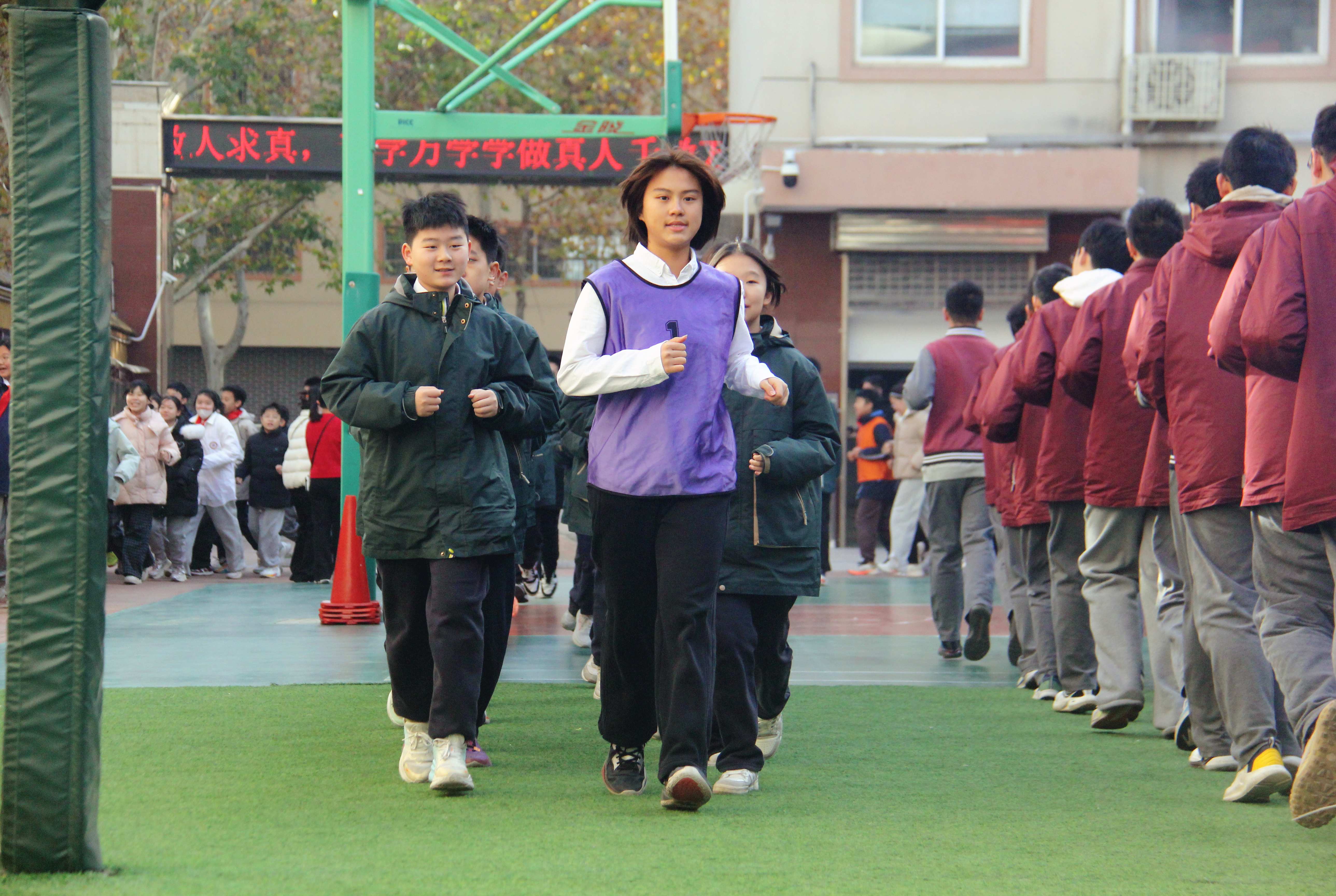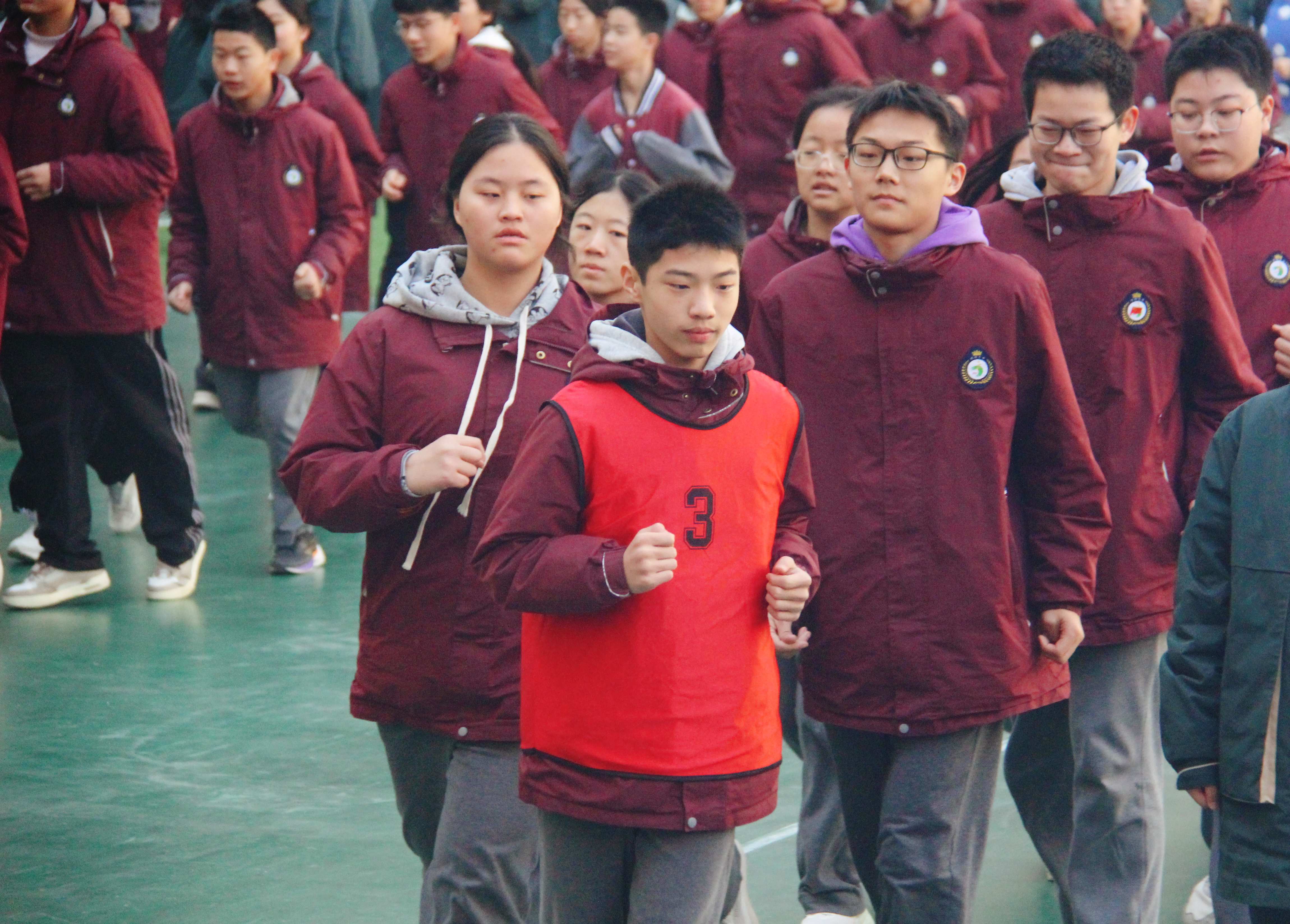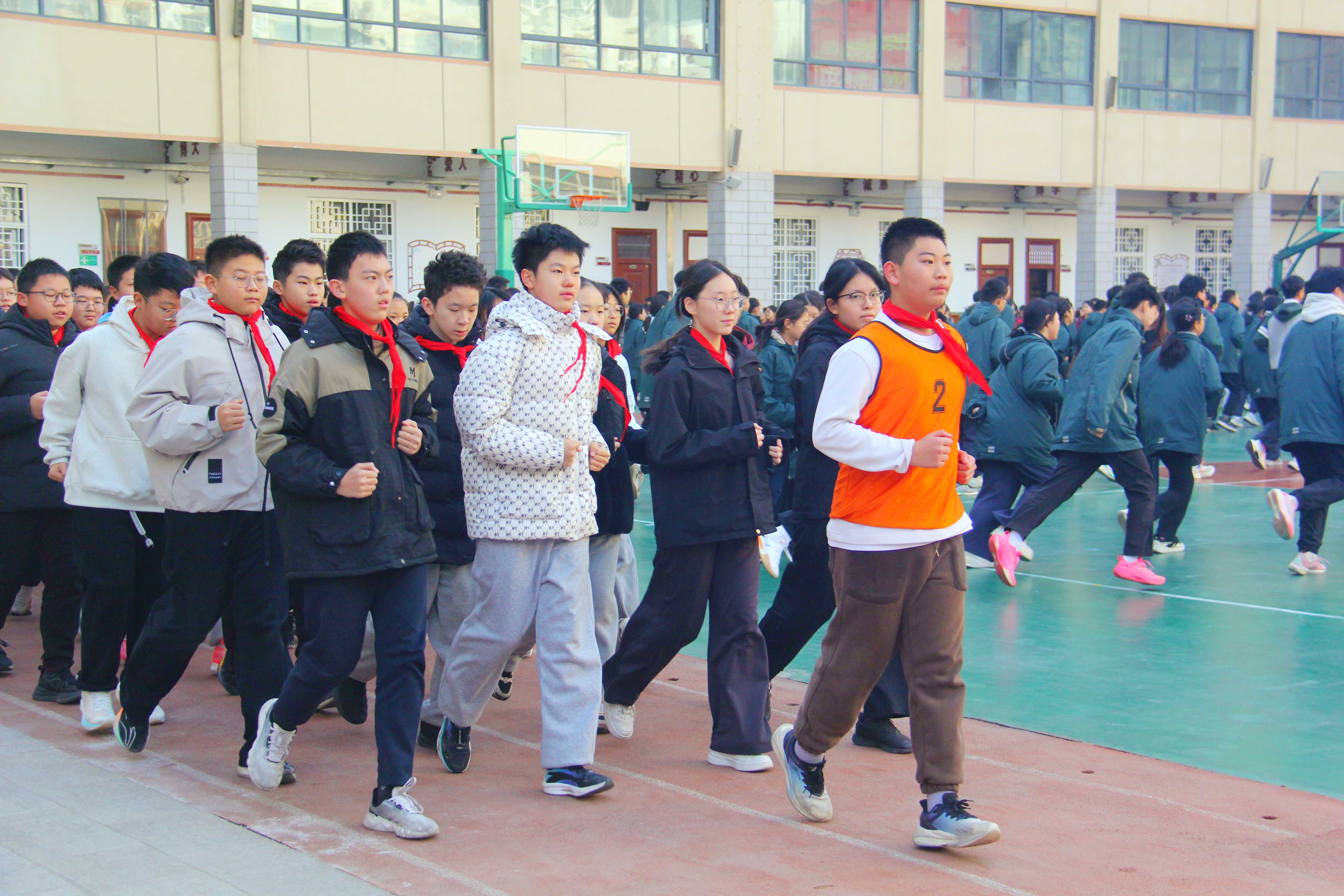 活动由学校体育组冀明薇老师主持,评委团由体育组专业教师及各科室主任共同组成。伴随激昂的音乐响起,各班级学生精神抖擞、队列整齐,迅速有序进入跑操区域。跑步过程中,同学们步伐一致、动作有力,嘹亮的口号接连响起,充分展现出七初东校区学子昂扬向上的青春风貌。
